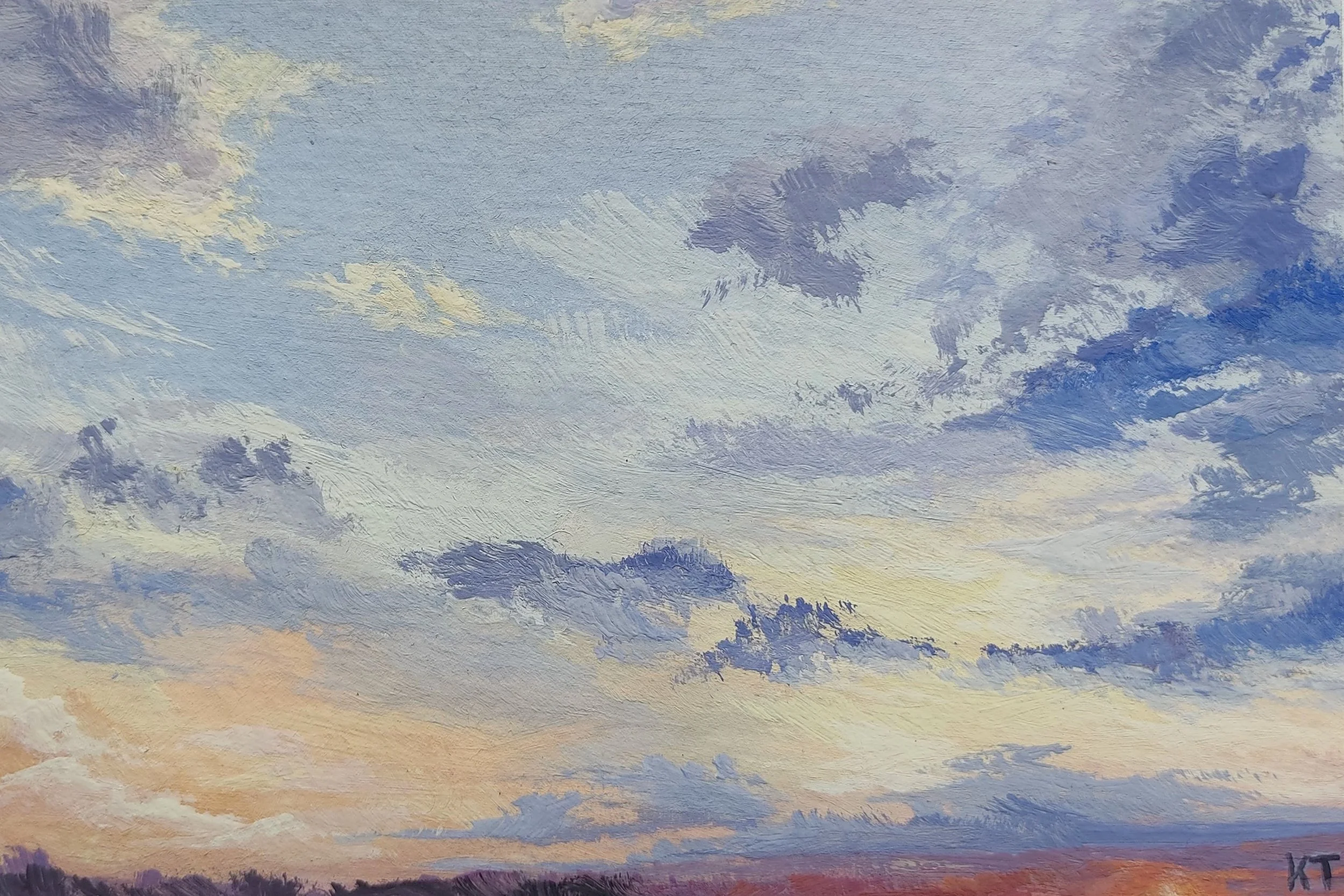 Wenn ich eine größere Malerei beginn, fertige ich zum Aufwärmen häufig kleine Studien an. Ich verwende Fotografien, die ich in den letzten Jahren angefertigt habe. Manchmal stellen mir auch Freund*innen und Familie spontane Fotografien zur Verfügung. Nach der Fertigstellung kannst du nun das Foto durch meine Augen sehen. Dieses Bild zeigt den Sonnenuntergang bei einem Spaziergang am Rand von meiner Heimatstadt Buxtehude.